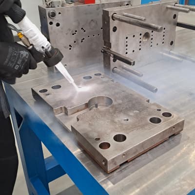 For precise cleaning of molds and pressing tools, we use dry ice blasting technology. By blasting CO2 ice particles, impurities on the surface are frozen and subsequently blown away by air pressure. This technology is the most environmentally friendly method for cleaning etchings and mirror finishes on injection molds and tools. Dry ice blasting does not involve the use of any chemicals or water, so no waste materials are generated, minimizing the impact on the environment.