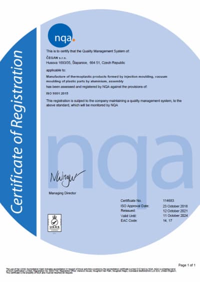Veškeré naše výrobní procesy probíhají v moderní hale, která splňuje nejpřísnější evropská měřítka na zpracování termoplastů, a v systému jakosti splňujícím požadavky normy ISO 9001 pro výrobu z nerezové oceli, ISO/TS 16949 a dále normy IATF pro zpracování termoplastů.